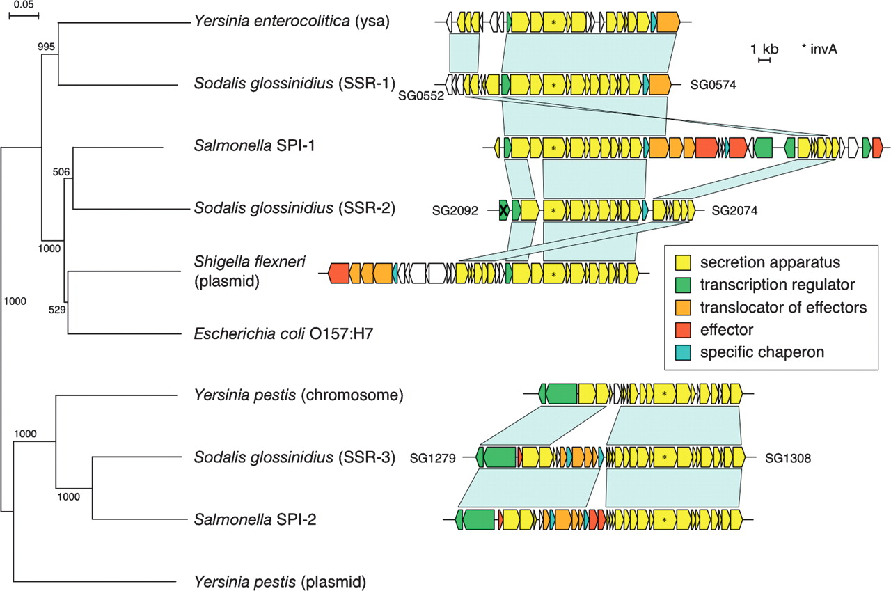 Phylogenetic relationship shared between Sodalis' three TTSS structures and those characterized from pathogenic microbes. The tree was based on amino acid sequence alignments of the invA gene product. Scale bars representing branch lengths and bootstrap values are displayed at each internal node. Genes associated with each cluster are depicted as arrows that indicate the direction of transcription. The arrows with a cross denote pseudogenes. The light blue bars between loci indicate the regions of sequence similarity and gene order conservation. The different colors depict the functional roles of their putative products.