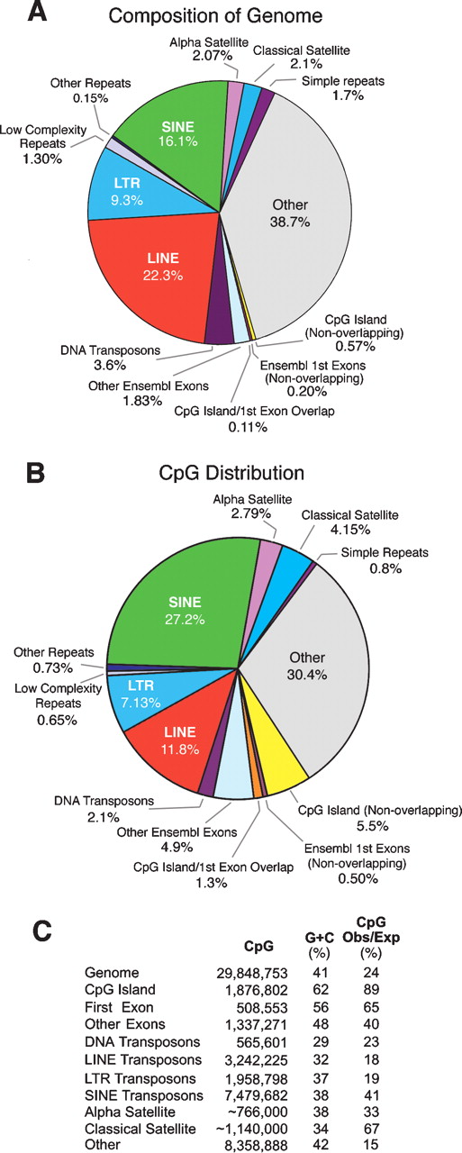Composition of the human genome and distribution of CpG sites. (A) Representation of sequence compartments in the human genome. (B) CpG content of the sequence compartments shown in A. (C) Total CpG numbers, G+C densities, and observed versus expected CpG frequencies for the compartments shown in A and B. The CpG island category included both first exon overlapping and nonoverlapping classes. Estimates of amount and CpG content of α and classical satellite DNA were from Eichler et al. (2004) and E.E. Eichler, pers. commun.