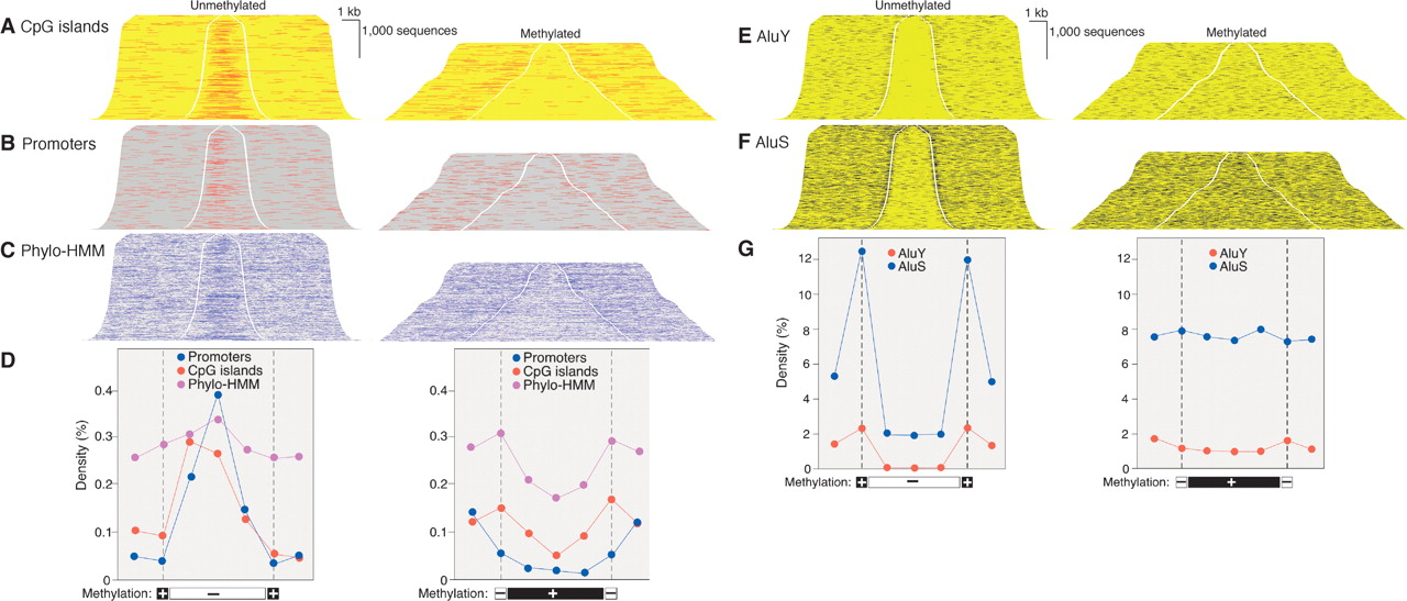 Regulatory sequences and Alu transposons in unmethylated and methylated domains. DNA was fractionated as shown in Figure 2 and cloned into plasmid vectors. BLAT alignment of paired end sequence reads allowed addition of sequence between end reads and of external sequence. Sequences were sorted by insert length and assembled into stacks; the gap indicates position of cleavage by McrBC (left) or RE (right). Genome features annotated at the UCSC genome browser (http://genome.ucsc.edu) were mapped onto sequence stacks in contrasting colors and with a threefold increase in line weight to improve visibility. All sequences shown were associated with a transcript annotated in Ensembl and transcription was from left to right.(A) Enrichment of CpG islands in unmethylated domains and depletion in methylated domains. (B,C) Enrichment in unmethylated domains and depletion in methylated domains of promoters (defined as in Trinklein et al. 2003) and sequences conserved among human, mouse, and rat by phylogenetic Hidden Markov Model analysis (Jojic et al. 2004). (D) Quantitative analysis of data shown in A,B,C. Methylated and unmethylated domains were normalized for length and divided into thirds. Feature density is plotted against the mean of the 5 kb of flanking sequence, at the cleavage site (indicated by broken vertical line) and for each of the three segments of the methylated and unmethylated domains. There were 142,694 CpG sites in the methylated domains and 75,017 in the unmethylated domains; total sequence lengths were 13,795,647 and 8,235,466 bp, respectively. (E,F) Exclusion of AluS and AluY transposons from unmethylated domains. (G) Quantitation of data of E and F as in Figure 1D.