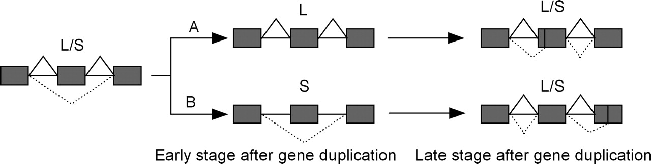 Schematic illustration for the evolution of alternative splicing after gene duplication. The ancestral gene has two alternative splice forms, L (long) and S (short). In the early stage after gene duplication, the L and S forms may become dominantly expressed in one of the duplicate copies A and B, respectively. In the late stage, some novel alternative splice forms may be generated.