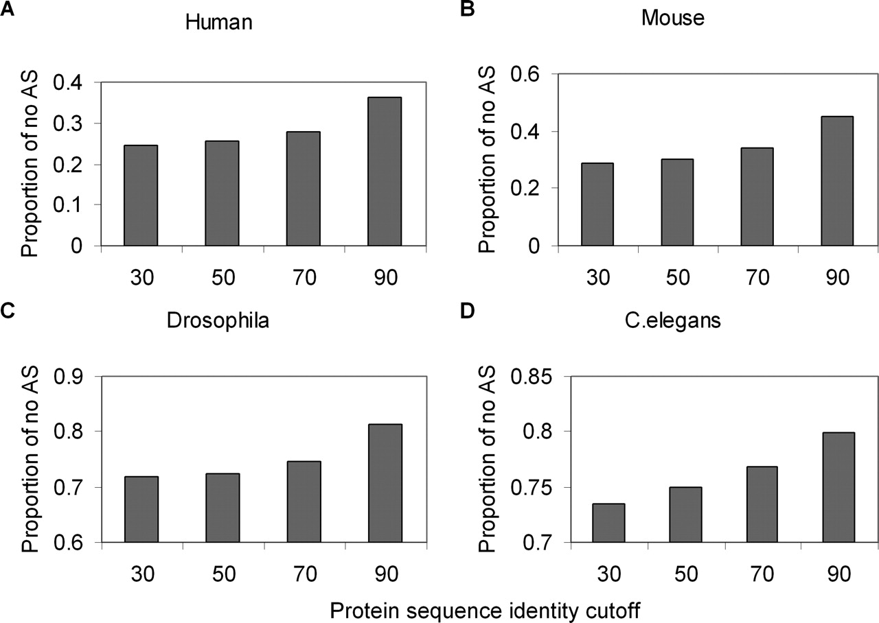 Recent duplicated genes are unlikely to be alternatively spliced (A-D). Each bar represents the proportion of genes that is not alternatively spliced in four model organisms. Genes having the sequence identity >30% and E-value <1E-10 were classified to the group 30. Similarly, the groups 50, 70, and 90 were under the identity cutoff 50%, 70%, and 90% respectively.
