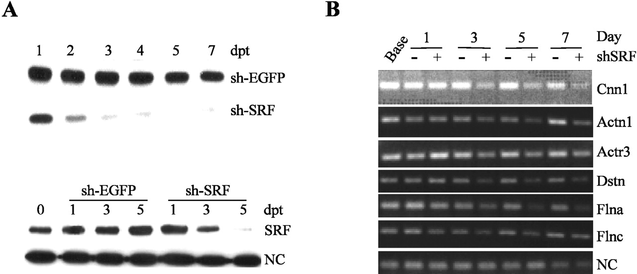 shRNA knockdown of SRF and novel CArG-containing target genes. (A) shRNA knockdown of endogenous SRF in A7r5 rat vascular smooth muscle cells (upper panel) and human coronary artery smooth muscle cells (HCASMC, lower panel). Cells were transduced with adenovirus carrying either a short hairpin (sh) to EGFP or SRF and total cell lysates harvested at the indicated days post-transduction (dpt) for Western blotting of SRF protein levels. Note the virtual absence of detectable SRF 5 dpt in both cell types; (NC) negative control protein Tuba whose gene does not contain functional CArG boxes. (B) Linear RT-PCR results showing shSRF-mediated suppression of Cnn1, Actn1, Actr3, Dstn, Flna, and Flnc mRNA expression in A7r5 smooth muscle cells. shSRF has little effect on the negative control (NC) gene Tuba, a gene that is not SRF-dependent.