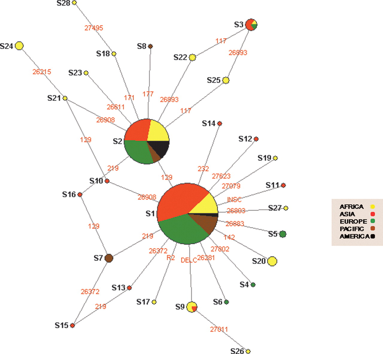 Median-joining network of PRNP haplotypes. The circle areas are proportional to the frequency of the haplotypes. The branch lengths are proportional to the number of allele differences they represent. The haplotype number is shown next to the circles, and mutation positions are indicated on the branches linking two haplotypes. Each color inside the circle indicates the presence of the haplotype in a specific continental region.