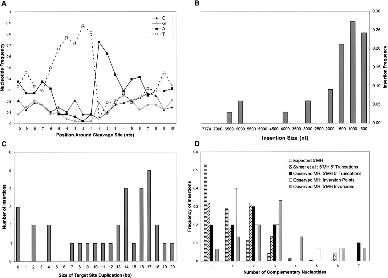 Characteristic features of L1 retrotransposition in de novo integrants. (A) Average frequencies of each base in the 10 nt surrounding the insertion sites of de novo inserts. (B) Insertion length distribution of 33 fully characterized integrants. Lengths of the inverted inserts were calculated by adding the lengths of inverted and direct segments. (C) The distribution of TSD lengths among 33 fully characterized inserts. (D) Observed microhomology (MH) frequencies at 5′ boundaries of noninverted 5′-truncated insertions (black), and at the inversion points (white) and 5′ boundaries (gray) of insertions containing inversions. Observed 5′MH frequencies were in agreement with those in cultured cells (Symer et al. 2002) (diagonal stripes), and were higher than expected for random ligation (Roth et al. 1985) using both the random nucleotide distribution (data not shown) and the nucleotide distribution in the 30-bp downstream of the insertion site (horizontal stripes).