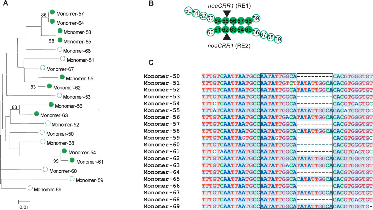 Phylogenetic analysis of a cluster of CentO monomers surrounding the first two CRRs in the core region of CEN4. (A) Neighbor-Joining tree obtained with the monomer sequence data. (Filled circles) Closely related monomers with bootstrap values >80% based on 500 replicates, (open circles) other monomers without clear relationship. (B) A segmental duplication event revealed by the Neighbor-Joining tree. The closely related pairs of monomers are connected, respectively, by short vertical lines. The integration sites of the noaCRR1 elements are marked by dark arrows. (C) A subregion of the alignment of the monomers analyzed above showing a 10-bp duplication site.