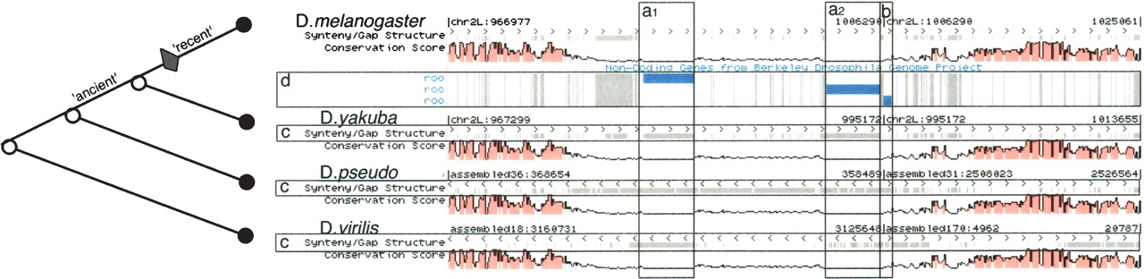 An alignment of four Drosophila sequences shown in the K-browser. The species are labeled by D. melanogaster, D. yakuba, D. pseudo (pseudoobscura), D. virilis. Each genome track has a conservation score track (pink) and (c) a gap track (gaps are demarcated in gray). The gaps in three genomes support the correct boundaries of the D. melanogaster insertion regions (a1, a2, and b). The insertion regions match the TE annotations (blue) in the BDGP noncoding gene track (d). The tree on the left-hand side depicts the phylogeny relationships between the species. The diamond shows the branch on which the transposon replications (a1) and (a2) occurred. The “ancient” branch is that on which replication (b) occurred, as indicated by the gaps in D. pseudoobscura and D. virilis but not in D. yakuba.