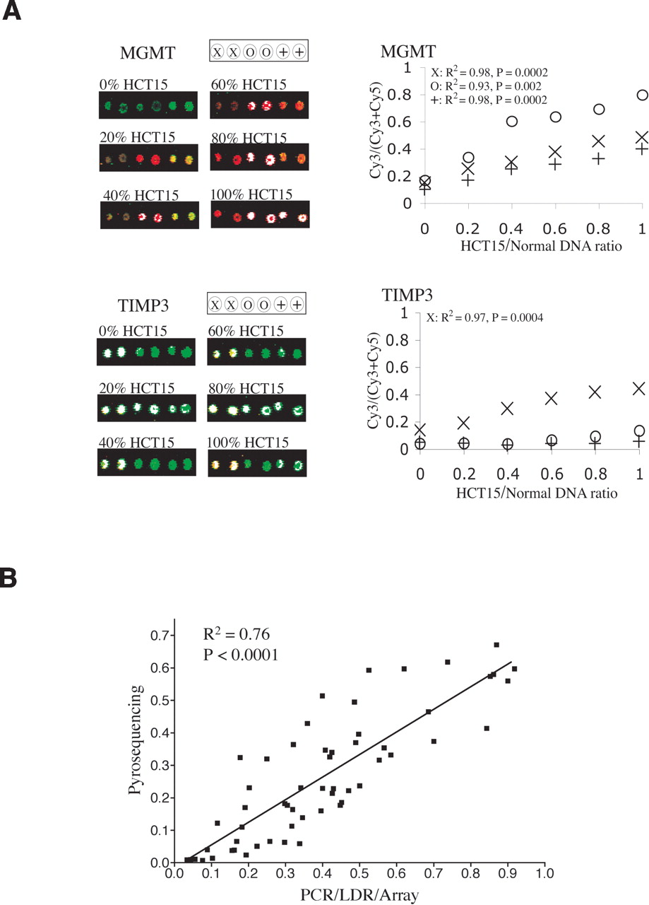 The quantification curves of the assay. Genomic DNAs of HCT15 and normal human lymphocytes were mixed in 0%, 20%, 40%, 60%, 80%, and 100% ratios and subjected to bisulfite-PCR/LDR/Universal Array analysis. (A) Representative array images are shown scanned in both Cy3 and Cy5 channels. False color red (Cy3) and green (Cy5) represent the methylated and unmethylated alleles of CpG dinucleotides, respectively. Color composites of the two channels reflect the methylation levels. Each zip-code was double-spotted on the array to ensure fabrication quality. MGMT and TIMP3 were used as examples to show the assay linearity measured at individual CpG dinucleotides. The plotted value at y-axis represents the fluorescence intensity Cy3/(Cy3 + Cy5) ratio. The value at x-axis represents the percentage of HCT15 mixed with normal human lymphocyte genomic DNAs. The R2 and P-values of each linear regression line were calculated, although the lines were omitted in the plots for visual clarity. Nearly no methylation was observed at two of the CpG sites of TIMP3 resulting in poor statistical correlation (circles: R2 = 0.81, P = 0.02; crosses: R2 = 0.08, P = 0.01). The experiments were repeated three times with different sample preparations and array hybridizations. The PCR and LDR primer sequences and their concentrations used in these experiments are listed in Supplemental Tables 3 and 4. (B) Comparison of the MGMT methylation level from 15 colorectal carcinomas using pyrosequencing technology and bisulfite/PCR/LDR/Universal Array. Three CpG sites were evaluated per DNA sample. The plotted value at y-axis represents the percentage of methylated cytosines in the tumor samples as obtained from pyrosequencing. The value at x-axis represents the ratio of fluorescence intensities Cy3/(Cy3 + Cy5). The mixed genomic DNAs of HCT15 and normal human lymphocytes shown in A were included as controls.