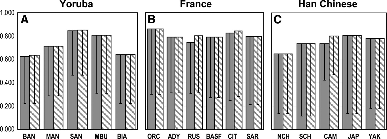 Average maximum r2 values of non-tag SNPs in a population with tagSNPs selected in HapMap proxy populations from the same geographic region. Population abbreviations are as in Table 1. An r2 threshold of 0.64 is used for tagSNP selection and evaluation. (A) Values when tagSNPs defined in Yorubas from Africa are used in the rest of African populations, (B) tagSNPs defined in French being used in the rest of European populations, (C) tagSNPs defined in Han Chinese being used in the rest of East Asian populations. For each case results for the “blind” test (opaque bars) and “ideal” test (dashed bars) are shown. Detailed information on number of SNPs and distribution of r2 values can be found in Supplemental Table 1. The 95th percentile values are shown as central bars from each mean value.