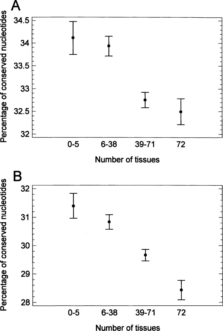 The product of the conserved sequence fraction and the between-species identity of this fraction (which can be considered as the fraction of conserved nucleotides) in introns of genes expressed in different numbers of human tissues (means with LSD intervals). (A) without correction. (B) corrected for identity of human Alu repeats and intron GC content, using the general linear model (GLM). (Only introns containing Alu repeats were taken in the latter case.) For the effect of the number of tissues in the GLM, P <10–8.