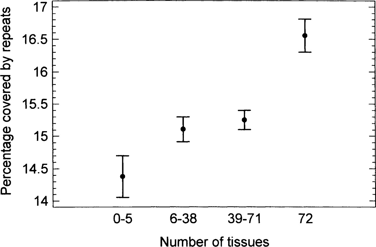 The fraction covered by lineage-specific repeats in introns of human genes expressed in different numbers of tissues (means with LSD intervals).