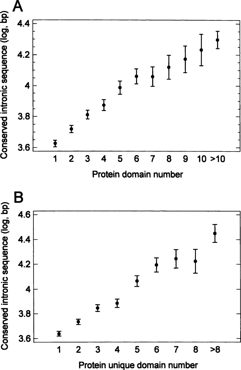 The length of conserved intronic sequence in human genes encoding for proteins with different numbers of functional domains (means with LSD intervals). (A) total number of domains. (B) number of unique (different) domains.