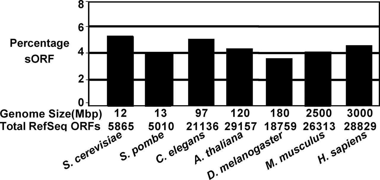sORFs constitute a similar percentage of annotated ORFs in representative eukaryotes. The percentage of sORFs for S. cerevisiae and representative eukaryotes was calculated and is depicted in the bar graph. The genome size (megabases) and the number of RefSeq ORFs for each eukaryote are displayed below the graph.