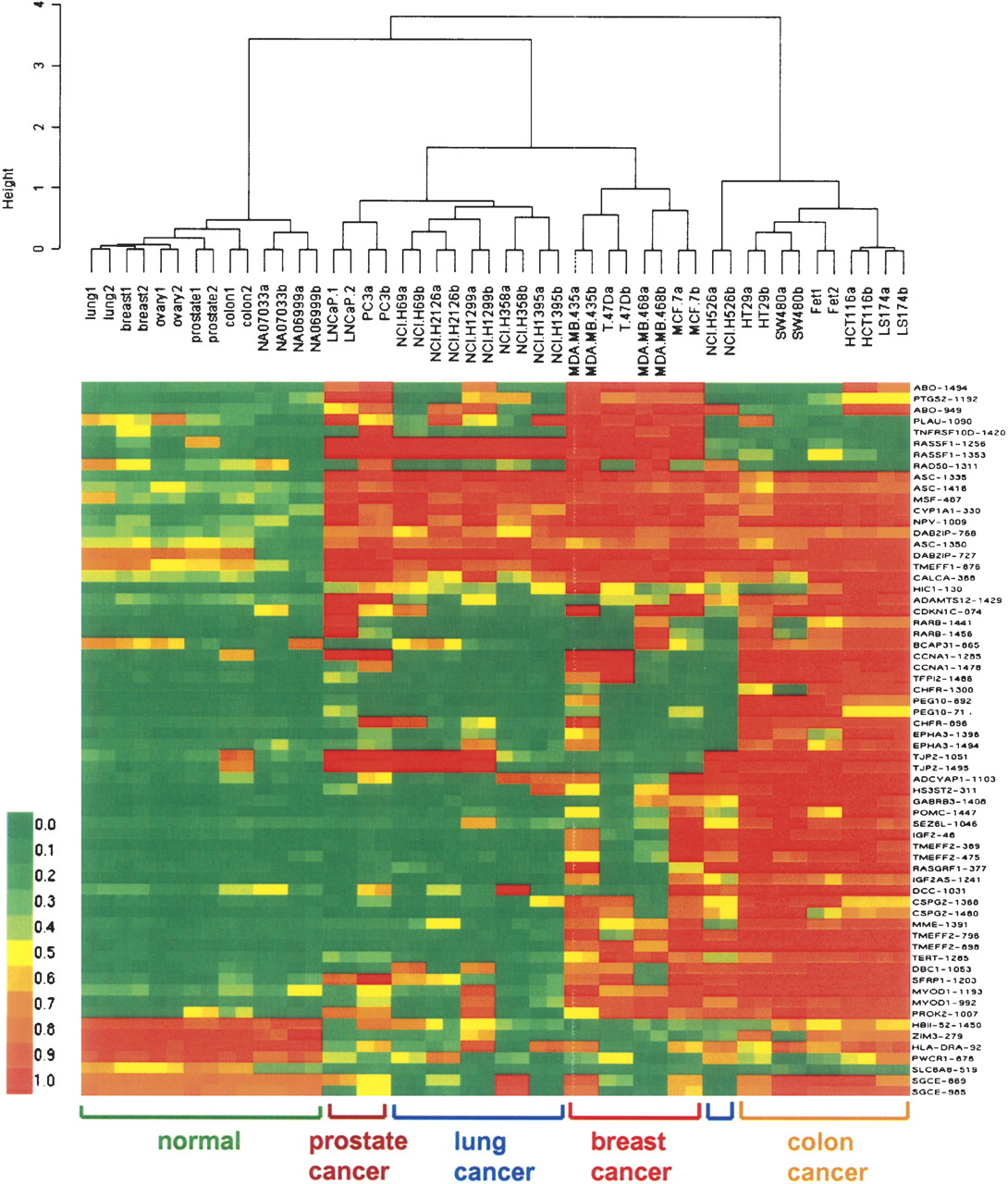 Methylation profiling in cancer cell lines. Seven DNA samples derived from different normal tissues and 17 colon, breast, lung, and prostate cancer cell lines were profiled. All cancer samples were correctly separated from normal samples using agglomerative clustering based on 64 cancer-specific methylation makers, and highly specific methylation signatures were obtained for each cancer type. Green, yellow, and red colors represent low, medium, and high methylation levels, respectively.
