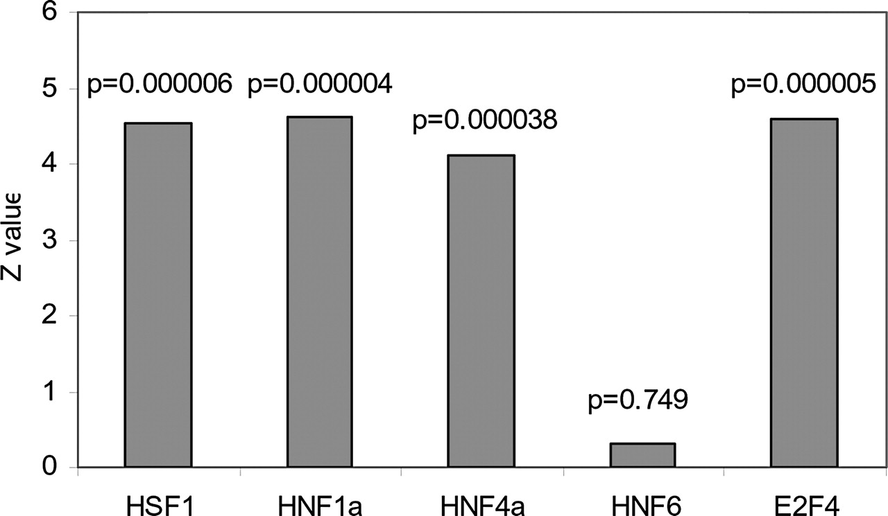 PAP's prediction of target genes of transcription factors is consistent with chromatin immunoprecipitation experiment data. Target genes of transcription factors HSF1, HNF1a, HNF4a, HNF6, and E2F4 were determined by previous chromatin immunoprecipitation experiments and were collected from the literature. The nonparametric Mann-Whitney U test was used to test whether these validated genes have higher scores in PAP's predictions. In each case, the Z score and the P-value were calculated.