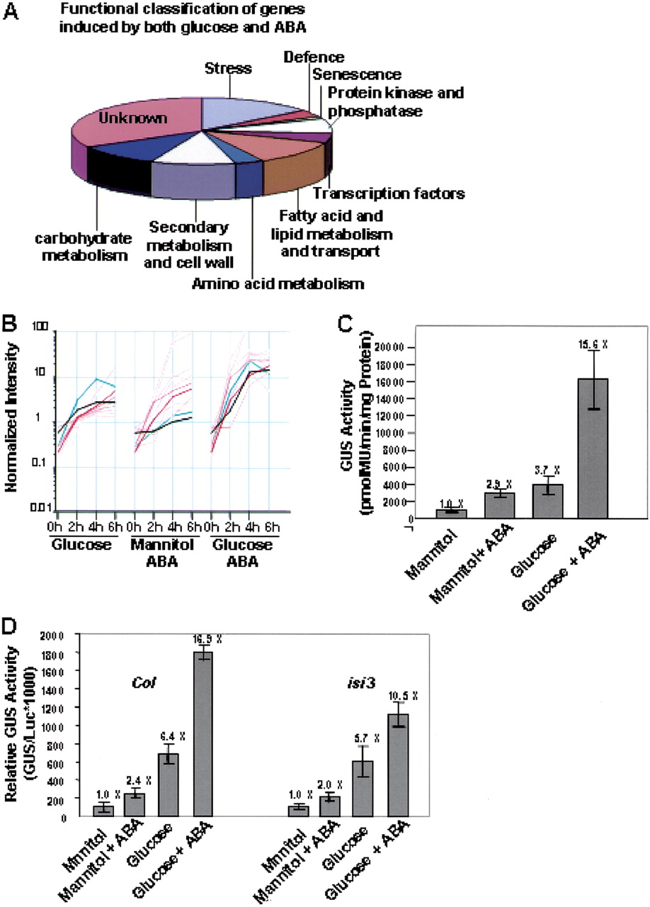 Glucose- and ABA-coregulated genes. (A) Functional classification of genes induced by both glucose and ABA. (B) Expression patterns of the set of 12 genes showing synergistic transcriptional responses to glucose and ABA. Expression patterns of the two genes encoding large subunits of AGPase (APL3 and AT2g21590) in response to glucose and ABA were indicated with a green line and black line, respectively. (C) Transcriptional responses of APL3:GUS promoter fusions to sugar and ABA in stable Arabidopsis transformants. Samples were taken from 7-d-old seedlings grown on the following media: 10 mM glucose + 90 mM mannitol (Mannitol), 100 mM glucose (Glucose), 10 mM glucose + 90 mM mannitol + 0.1 μM ABA (Mannitol + ABA), and 100 mM glucose + ABA (Glucose + ABA). The fold induction compared with the osmotic control (Mannitol) is given. Error bars represent the standard error from 10 independent transformants. (D) Response of the APL3 promoter to sugar and ABA in Arabidopsis protoplasts. Protoplasts were made from Col or isi3 7-d-old seedlings. Protoplasts were cultured in the following media: 400 mM mannitol, 400 mM glucose, 400 mM mannitol + 10 μM ABA and 400 mM glucose + 10 μM ABA. GUS activity was measured and normalized to Luciferase (Luc) activity expressed from the CaMV 35S promoter. The fold induction compared with the osmotic control of each genotype are given. Error bars represent the standard error of the mean from three samples.
