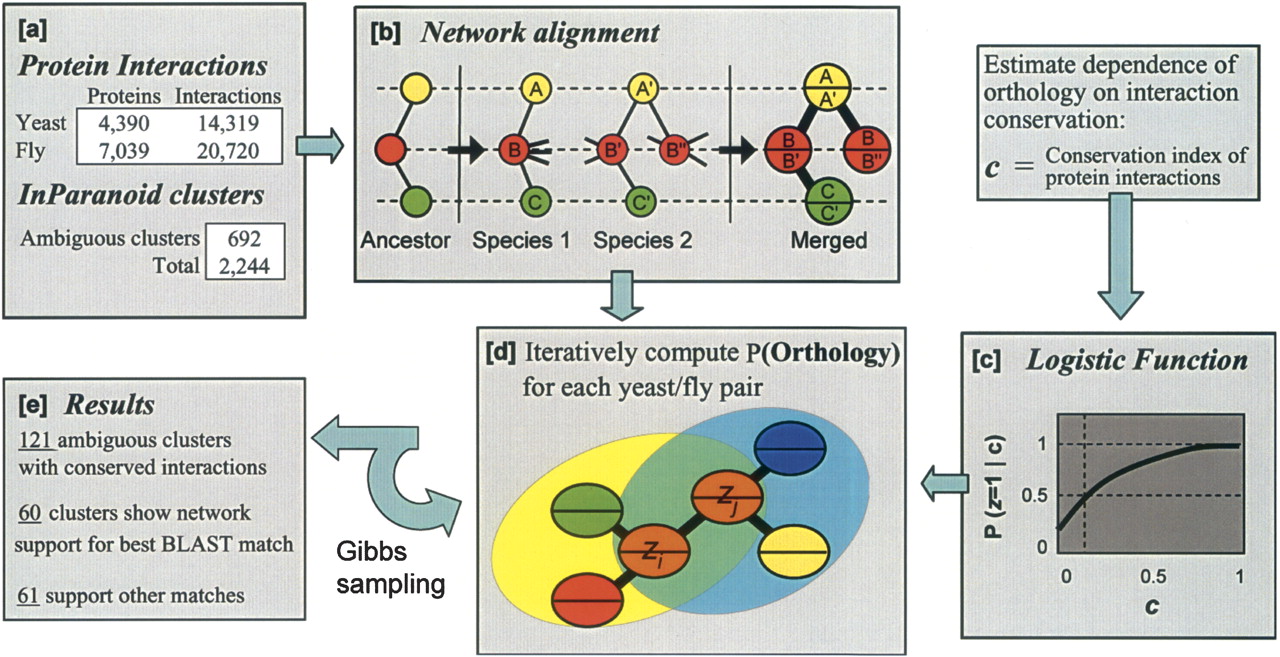 Overview of the method. (a) Protein–protein interaction networks for yeast and fly are combined with clusters of orthologous yeast and fly protein sequences as determined by the Inparanoid algorithm. (b) Networks are aligned into a merged graph representation. In this example, a gene duplication results in two proteins B′ and B″ in species 2 that are orthologous to protein B in species 1. One of these proteins may experience a gain and/or loss of interactions to enable new functional roles (Wagner 2003); however, only conserved interactions are represented in the alignment graph. (c) The logistic function shown in Figure 1B is used to compute the probability of functional orthology for a protein pair given the states of functional orthology for its network neighbors. (d) This probability is updated for each pair over successive iterations of Gibbs sampling. (e) The final probabilities confirm 60 of the best BLAST match pairings. The network supports a different hypothesis for 61 pairings.