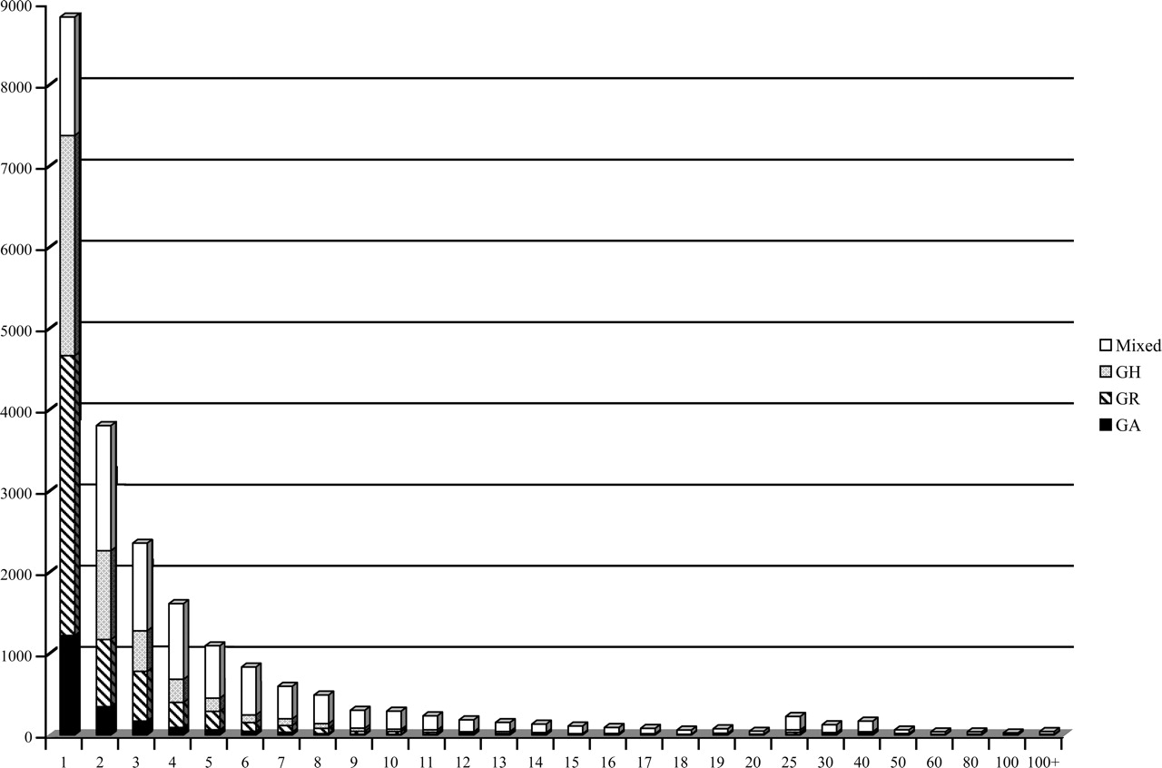 Histogram of number of EST members in a contig. Different patterns and shading of the bars indicate contigs composed of ESTs from a single species and those derived from ESTs from more than one species. Contigs with more than 100 EST members are not illustrated.