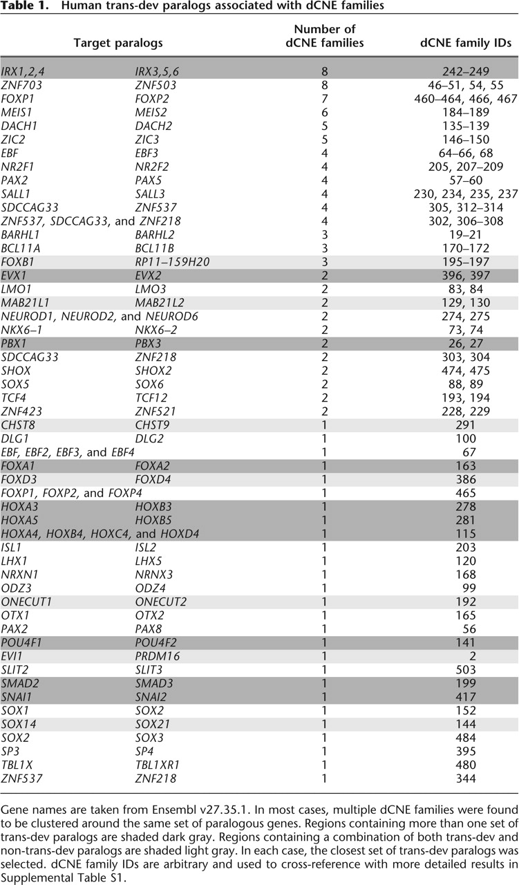 Gene names are taken from Ensembl v27.35.1. In most cases, multiple dCNE families were found to be clustered around the same set of paralogous genes. Regions containing more than one set of trans-dev paralogs are shaded dark gray. Regions containing a combination of both trans-dev and non-trans-dev paralogs are shaded light gray. In each case, the closest set of trans-dev paralogs was selected. dCNE family IDs are arbitrary and used to cross-reference with more detailed results in Supplemental Table S1.