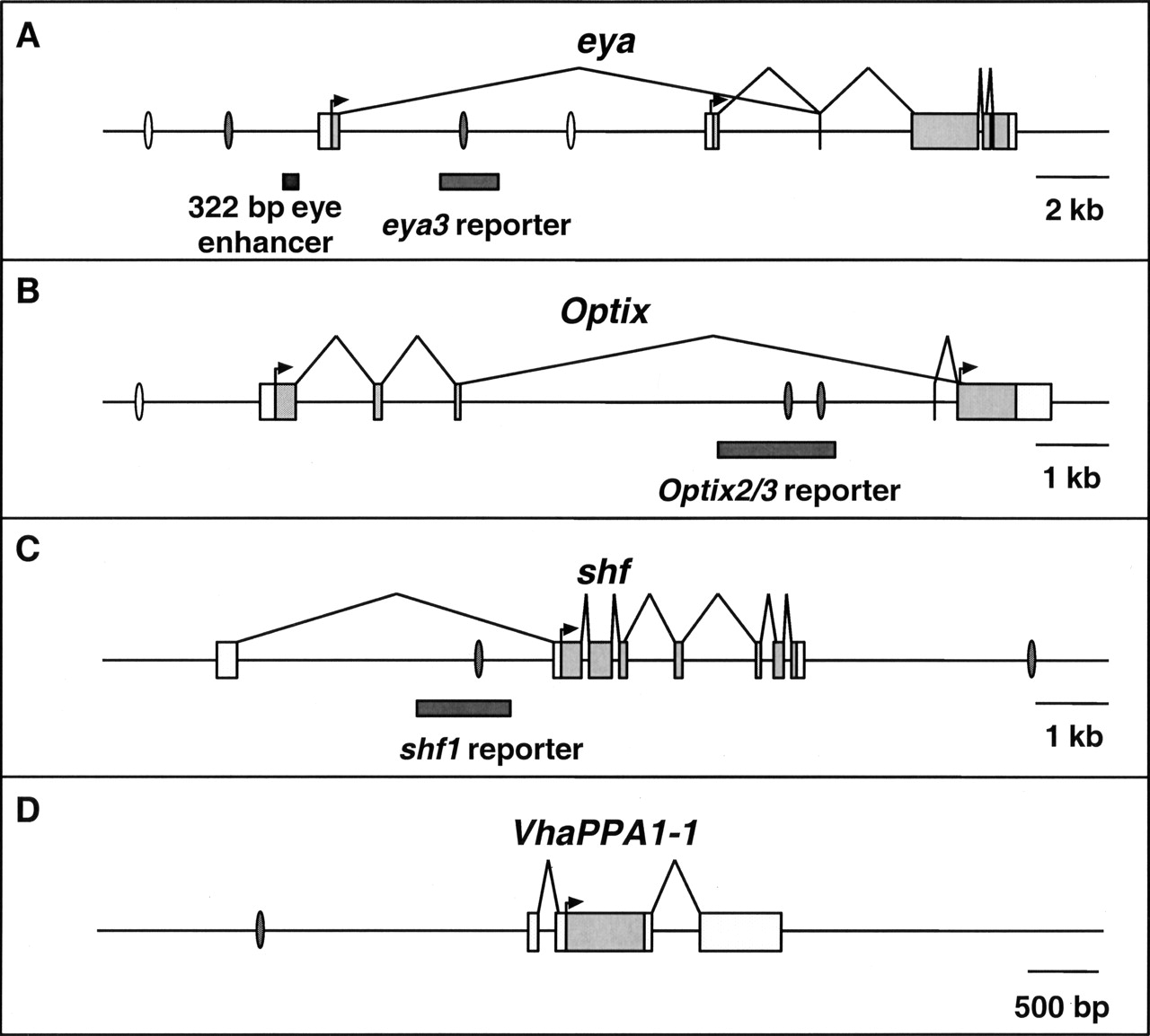 The genomic loci of eya (A), Optix (B), shf (C), and VhaPPA1–1 (D). Ey binding sites shown to bind Ey by EMSAs are shown as grey ovals, predicted binding sites that did not bind Ey as open ovals. Reporter fragments responsive to Ey are shown as gray bars. In the transcribed regions, untranslated sequence is shown as white boxes and the coding region is shown in gray. The shf1 and Optix2/3 reporters are expressed in the third instar eye disc and are induced by ectopic ey; the eya3 reporter is only induced by ectopic ey. In A, a previously described 322-bp eye enhancer is indicated by a black bar.