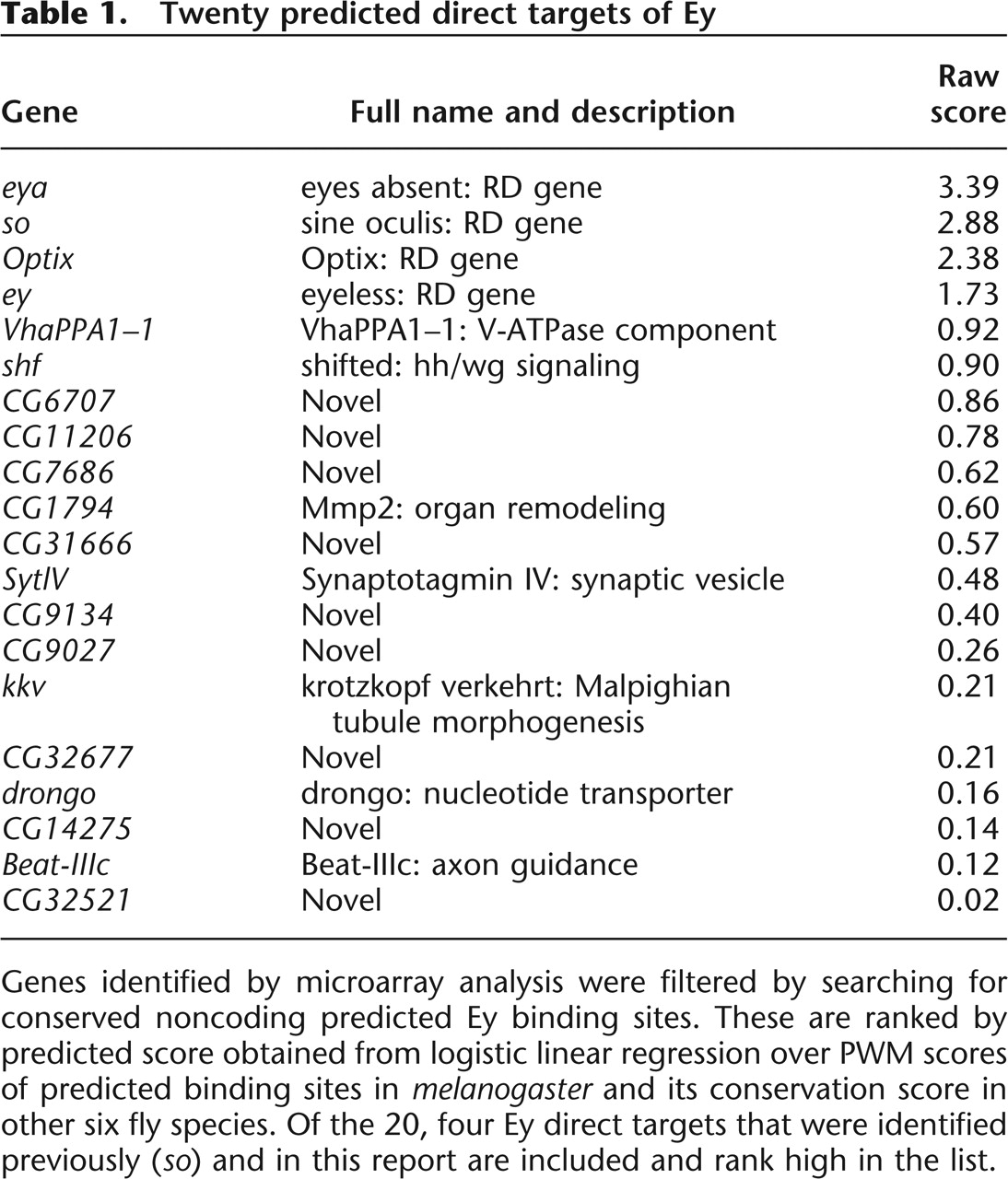 Genes identified by microarray analysis were filtered by searching for conserved noncoding predicted Ey binding sites. These are ranked by predicted score obtained from logistic linear regression over PWM scores of predicted binding sites in melanogaster and its conservation score in other six fly species. Of the 20, four Ey direct targets that were identified previously (so) and in this report are included and rank high in the list.
