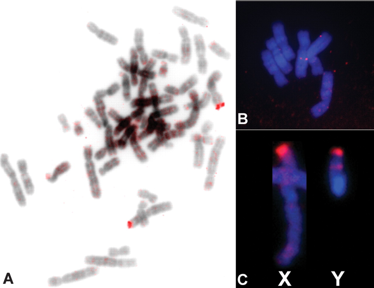 In situ hybridization of [GATA]4G oligomer (red signals) to human metaphase chromsomes. (A) Female metaphase with DAPI counterstain displayed in reverse contrast. (B) Oligomer hybridization to an ∼7-kb minisatellite; note the small size of the signal relative to the multimegabase regions defined by GATA. (C) Male sex chromosomes.