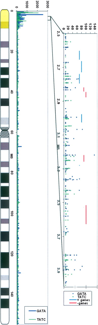Physical distribution of [GATA]n on the X chromosome based on NCBI release B35.1 unmasked sequence. The histogram on the left shows the distribution of [GATA]n/[TATC]n-derived word frequencies in 100-kb bins along the chromosome. On the right is a detailed map of the location and length of [GATA]n/[TATC]n tandem repeats in the distal p arm of the X chromosome. Single contiguous repeats are defined as being at least 8 bp long. Interruptions of no more than 4 bp (one repeat unit) of incorrect sequence were allowed if followed by at least two more correct units. Location of genes on the + and − strands are also indicated. The region highlighted in yellow indicates XE in both graphs.