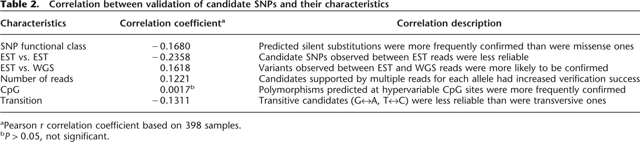 Correlation between validation of candidate SNPs and their characteristics