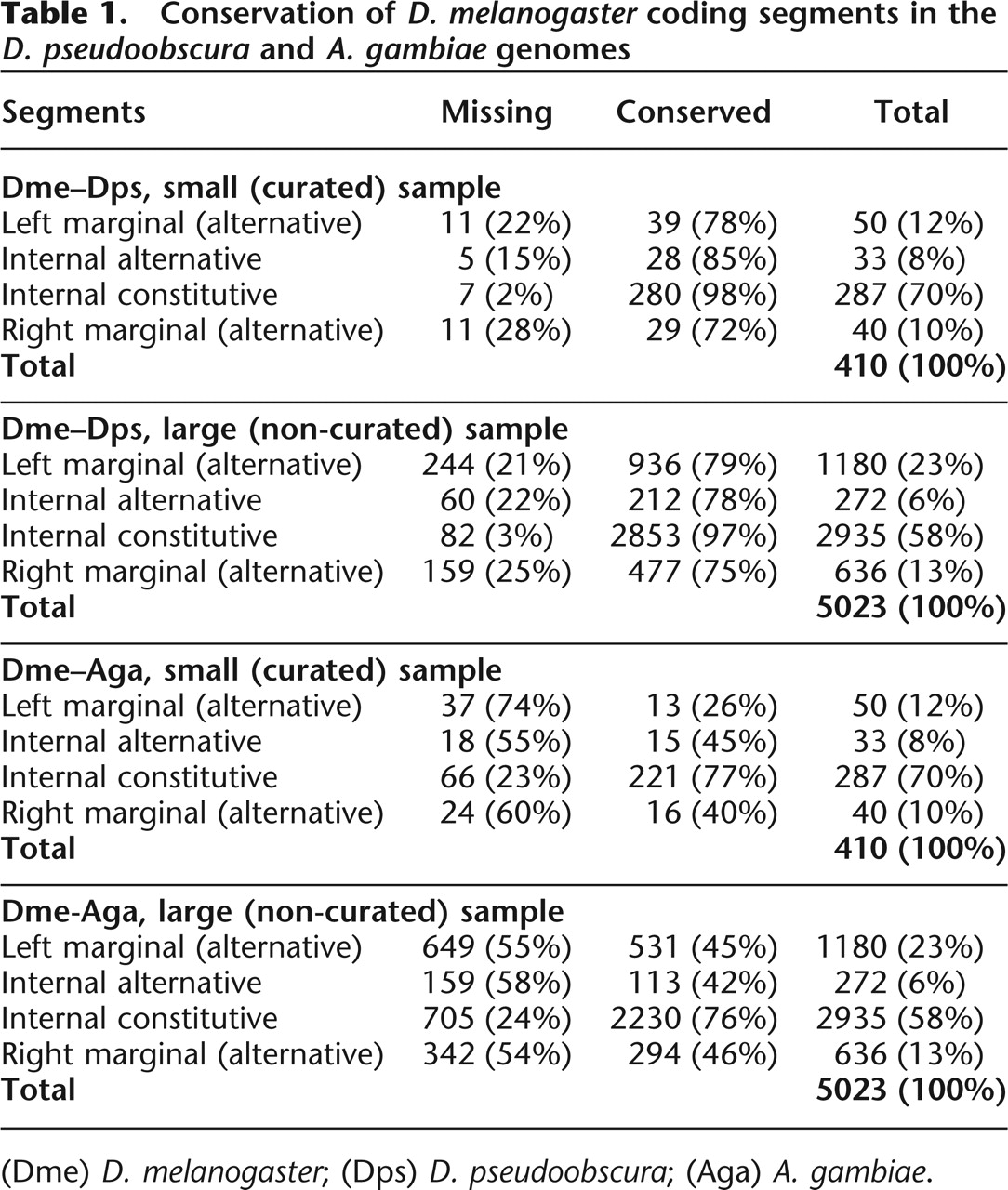 Conservation of D. melanogaster coding segments in the D. pseudoobscura and A. gambiae genomes