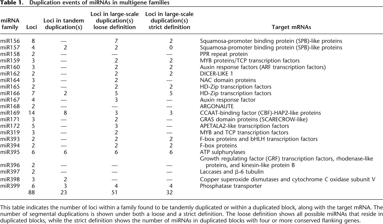 This table indicates the number of loci within a family found to be tandemly duplicated or within a duplicated block, along with the target mRNA. The number of segmental duplications is shown under both a loose and a strict definition. The loose definition shows all possible miRNAs that reside in duplicated blocks, while the strict definition shows the number of miRNAs in duplicated blocks with four or more conserved flanking genes.