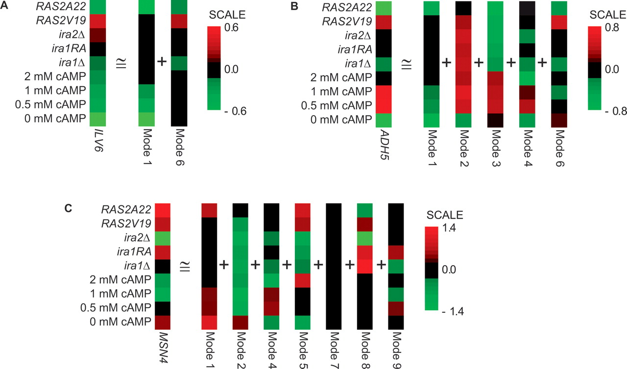 Decomposition of expression patterns of individual genes. The expression pattern (left) and equivalent sum of SVD components (right) are shown for three representative genes: (A) ILV6, (B) ADH5, and (C) MSN4. Modes shown correspond to gene sets that include the gene; contributions from other modes were not significant. Raster plots are colored with red (positive), green (negative), and brightness proportional to value.