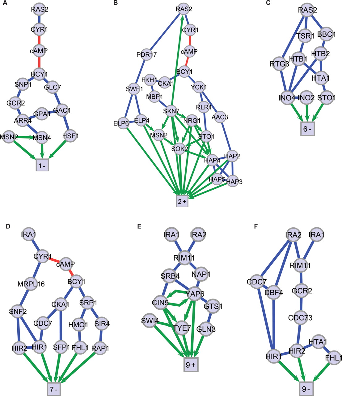 Expression-component subnetworks. Molecular interaction subnetworks are rendered for SVD gene sets with significant gene annotations and transcription factors: (A) 1-Negative, (B) 2-Positive, (C) 6-Negative, (D) 7-Negative, (E) 9-Positive, (F) 9-Negative. Four additional subnetworks for which significant gene annotations and transcription factors were found are shown in Supplemental Figure 3. The square nodes of each subnetwork represent a large number of differentially expressed genes and are labeled by mode number and positive or negative regulation. Protein–protein interaction edges are blue. Protein–DNA interactions are green directional edges. Red edges are interactions with the small molecule cAMP.