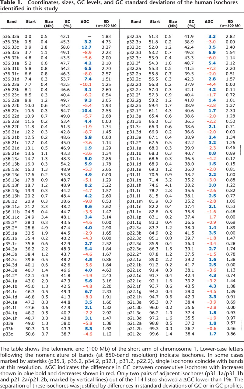 The table shows the telomeric end (100 Mb) of the short arm of chromosome 1. Lower-case letters following the nomenclature of bands (at 850-band resolution) indicate isochores. In some cases marked by asterisks (p35.3, p35.2, p34.2, p32.1, p31.2, p22.2), single isochores coincide with bands at this resolution. ΔGC indicates the difference in GC between consecutive isochores with increases shown in blue bold and decreases shown in red. Only two pairs of adjacent isochores (p31.1a/p31.1b and p21.2a/p21.2b, marked by vertical lines) out of the 114 listed showed a ΔGC lower than 1%. The separation of these isochores was justified by differences in standard deviations of GC or in GC profiles.