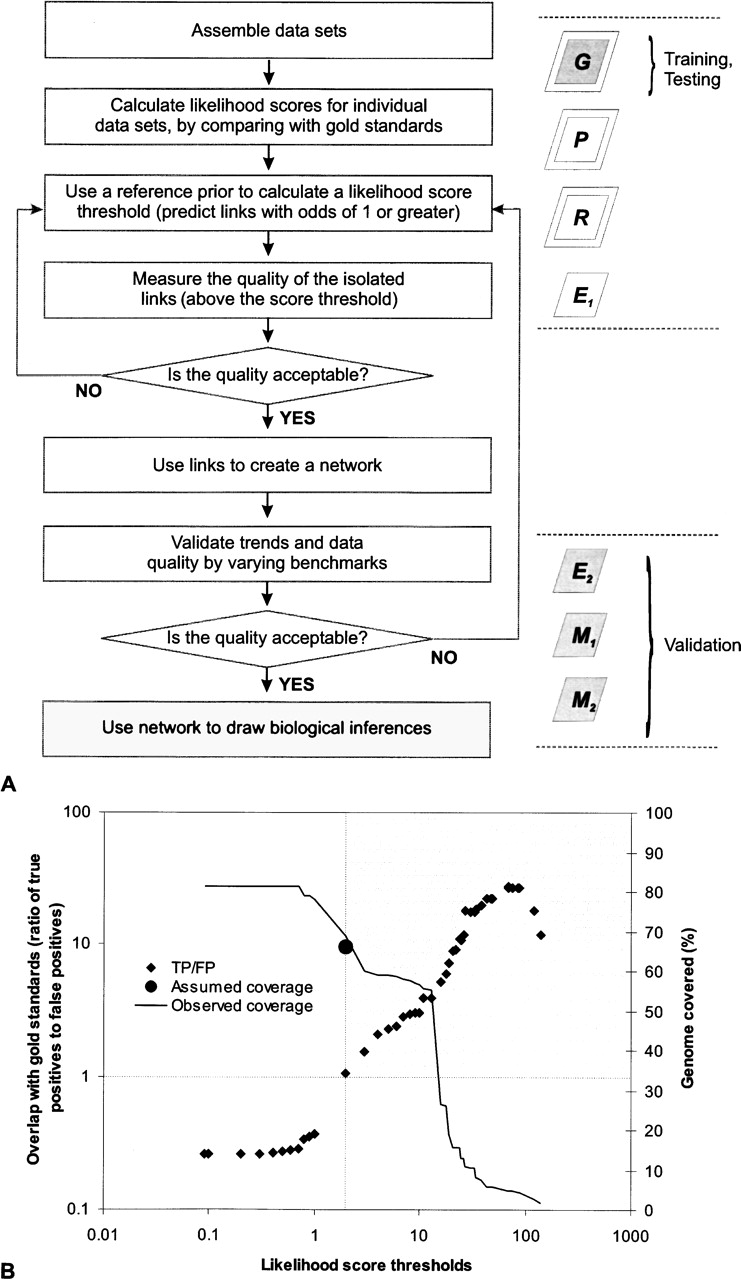 A generalized strategy for integrating diverse functional genomics data and reconstructing functional interaction networks. (A) A salient feature of this strategy involves the use of reference priors containing an assumed number of links, in the absence of knowledge about gene interactions in a genome. An appropriate prior that accurately reflects the state of genome can then be used to isolate a confident result set. (G) Benchmark gold standards; (P) phylogenetic profile data; (R) Rosetta stone linkage data; (E) gene expression data (E1: Bozdech et al. 2003; E2: Le Roch et al. 2003); (M) mass spectrometric data (M1 and M2). Dark boxes indicate benchmarks; boxes with double borders indicate in silico data. (B) Prior knowledge about the possible number of functionally interacting proteins leads to a corresponding likelihood score threshold, with posterior odds of finding a true pair of functionally linked proteins greater than one. Likelihood score thresholds and the ratio of true to false positives were calculated as described by Jansen et al. (2003). For our chosen threshold, the number of proteins assumed to functionally interact with each other corresponds very closely with the number of proteins with predicted functional linkages in our final data set. Linkages from the shaded area were used for network reconstruction. (Cross-hair) Chosen likelihood score threshold and estimated accuracy; (●) approximate coverage described by our prior belief; (♦) ratio of true positives to false positives.