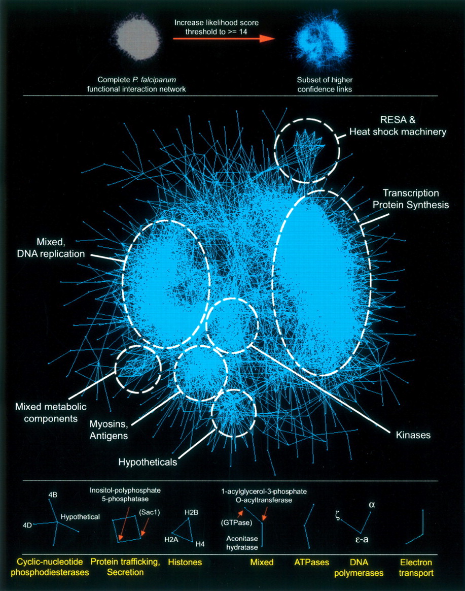 A subset of high confidence links as visualized by Large Graph Layout package (LGL, Adai et al. 2004). The subset of links at a score threshold of 14 or greater contains 10× the number of true positives than false positives when measured against our gold standards. Several functionally relevant subnetworks, such as that of proteins involved in transport, DNA polymerases, and histone proteins, are also illustrated. These subnetworks also reveal the various types of functionally relevant associations available; members that constitute parts of pathways, possess similar function, or even are subunits of protein complexes are visible. Edges in the graph are unweighted.