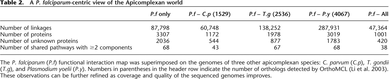 The P. falciparum (P.f) functional interaction map was superimposed on the genomes of three other apicomplexan species: C. parvum (C.p), T. gondii (T.g), and Plasmodium yoelii (P.y). Numbers in parentheses in the header row indicate the number of orthologs detected by OrthoMCL (Li et al. 2003). These observations can be further refined as coverage and quality of the sequenced genomes improves.