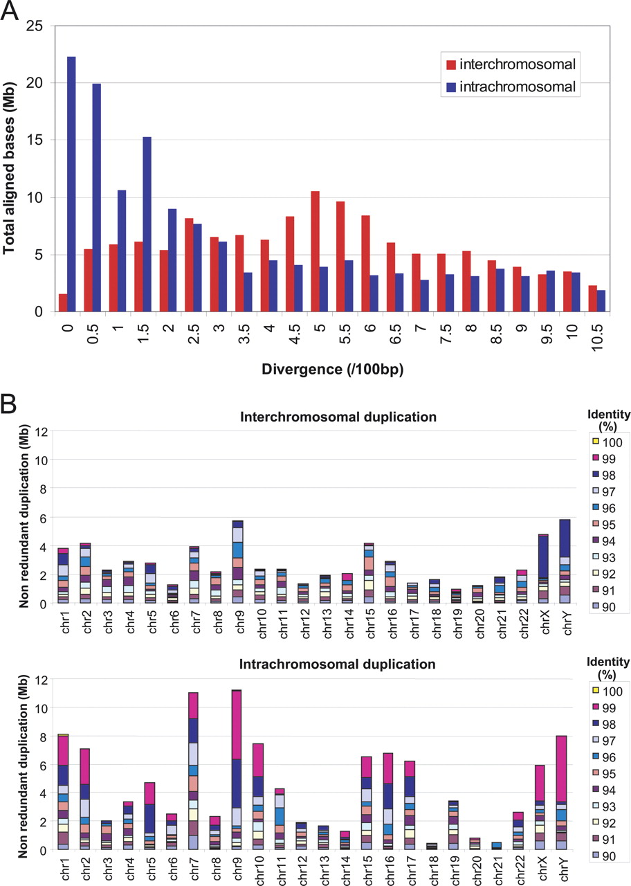 Distribution of recent segmental duplications in the human genome. (A) Sequence identity. Interchromosomal (red) and intrachromomal (blue) segmental duplications in the human genome sequence (May 2004 build) were binned according to their divergence, and the total number of aligned basepairs was determined. Divergence (K) is calculated as the number of substitutions per site between the two duplication alignments. (B) Chromosomal distribution. The distribution of recent segmental duplications is depicted with the color bars representing different percent identities. The distribution within each chromosome was calculated as the proportion of pairwise alignments at each percent identity.