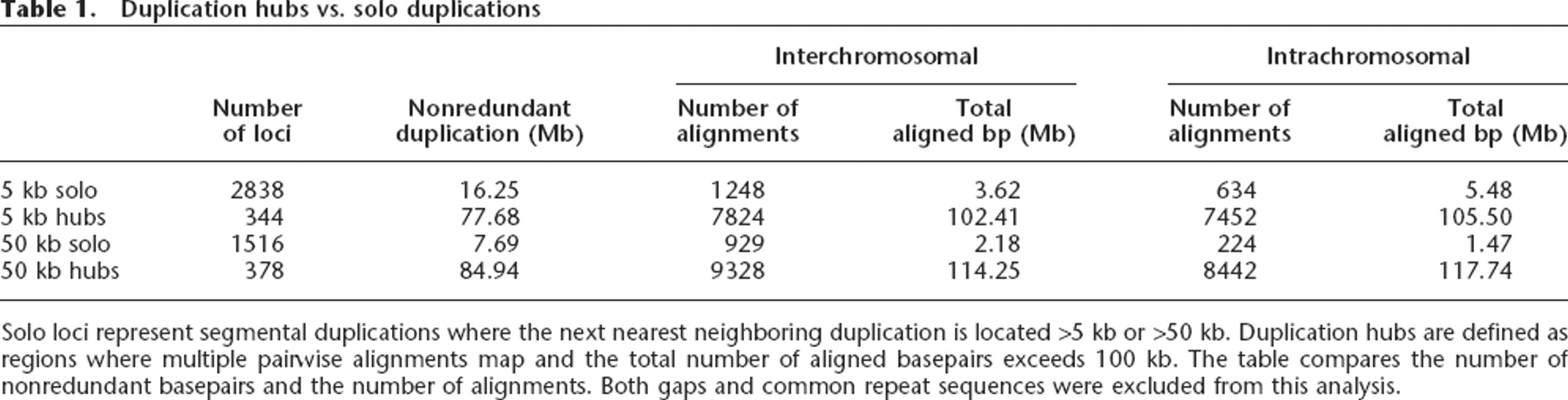 Solo loci represent segmental duplications where the next nearest neighboring duplication is located >5 kb or >50 kb. Duplication hubs are defined as regions where multiple pairwise alignments map and the total number of aligned basepairs exceeds 100 kb. The table compares the number of nonredundant basepairs and the number of alignments. Both gaps and common repeat sequences were excluded from this analysis.