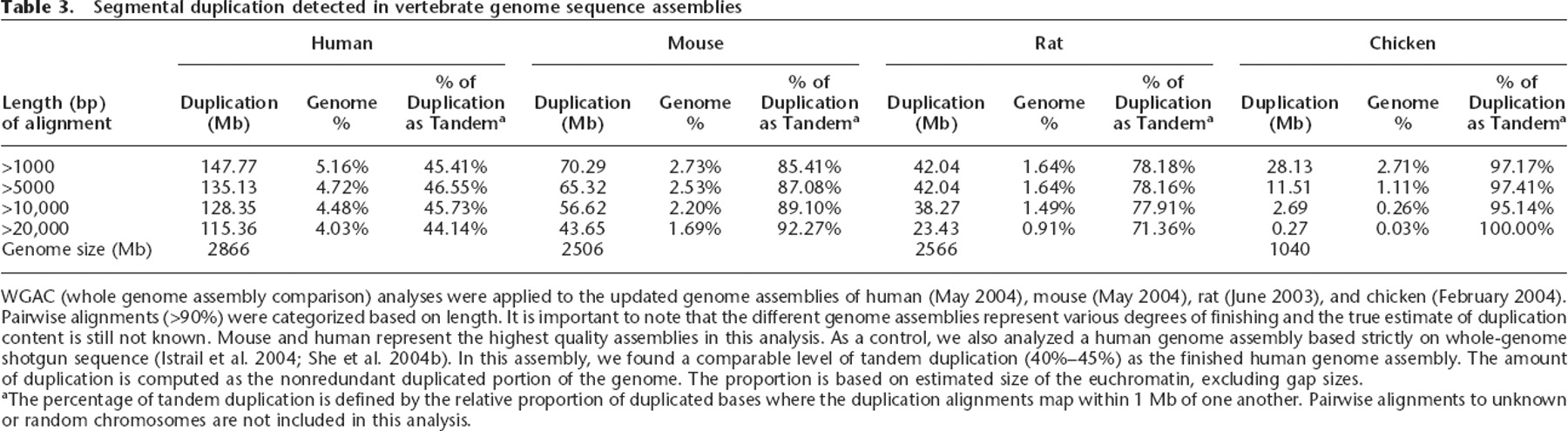 WGAC (whole genome assembly comparison) analyses were applied to the updated genome assemblies of human (May 2004), mouse (May 2004), rat (June 2003), and chicken (February 2004). Pairwise alignments (>90%) were categorized based on length. It is important to note that the different genome assemblies represent various degrees of finishing and the true estimate of duplication content is still not known. Mouse and human represent the highest quality assemblies in this analysis. As a control, we also analyzed a human genome assembly based strictly on whole-genome shotgun sequence (Istrail et al. 2004; She et al. 2004b). In this assembly, we found a comparable level of tandem duplication (40%–45%) as the finished human genome assembly. The amount of duplication is computed as the nonredundant duplicated portion of the genome. The proportion is based on estimated size of the euchromatin, excluding gap sizes.