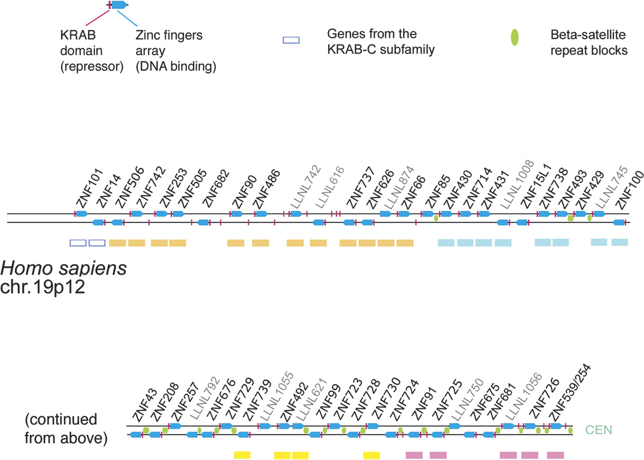 A diagram of the KRAB-ZNF cluster on HSA19p12 containing genes related to the ZNF91 subfamily. The map shows the physical order of the KRAB-zinc finger loci in the cluster, but is not scaled for genomic distances or relative size. Each finger-containing locus is represented by a blue arrow pointing 5′ to 3′ (left-to-right above the line, opposite strand, below). Loci that contain a KRAB have a red bar at the 5′ end of the symbol. Isolated red bars are KRAB-only pseudogene fragments (not labeled). Locus designations with the format “LLNLxxx” are from the new zinc finger catalog (Huntley et al. 2006) and are here used for pseudogene loci (light-gray text). Colored boxes beneath loci correspond to clade membership in the phylogeny (Fig. 3). In some cases, labeled genes in the cluster maps were not included in the phylogeny in Figure 3 because the spacer region used to create the phylogeny was modified or deleted from the locus, or because they were very divergent and not members of the ZNF91 subfamily, notably the “KRAB-C subfamily” loci (blue outline boxes). The relative positions of β-satellite repeat blocks between loci in this cluster are indicated by green ovals between the lines.
