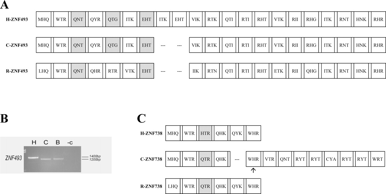 Zinc finger exon analysis for ZNF493 and ZNF738, two divergent genes from the ZNF431 clade. The alignments include the human predicted proteins and their orthologs determined from the chimpanzee and rhesus genomic data. Finger boxes, amino acid codes, predicted frameshifts, and degenerate finger shading are as in Figure 4B. The alignment for the predicted ZNF493 proteins (A) shows that the human version has two additional zinc finger motifs compared with both its chimpanzee and rhesus orthologs, indicating the change is an addition of fingers in the human. (B) The relative sizes of ZNF493 zinc finger exon PCR products from genomic DNA of human, chimpanzee, and bonobo is consistent with the human/chimpanzee difference in finger number; species designations are as in Figure 4A. (C) The chimpanzee ZNF738 protein’s differences with the human version, based on draft genomic sequence, include a deleted finger motif, a substitution that eliminates the stop codon seen in human, and a possible frameshift after the deleted finger. Although these differences have not been confirmed, any would change the predicted translation of the chimpanzee protein compared with the human ortholog.