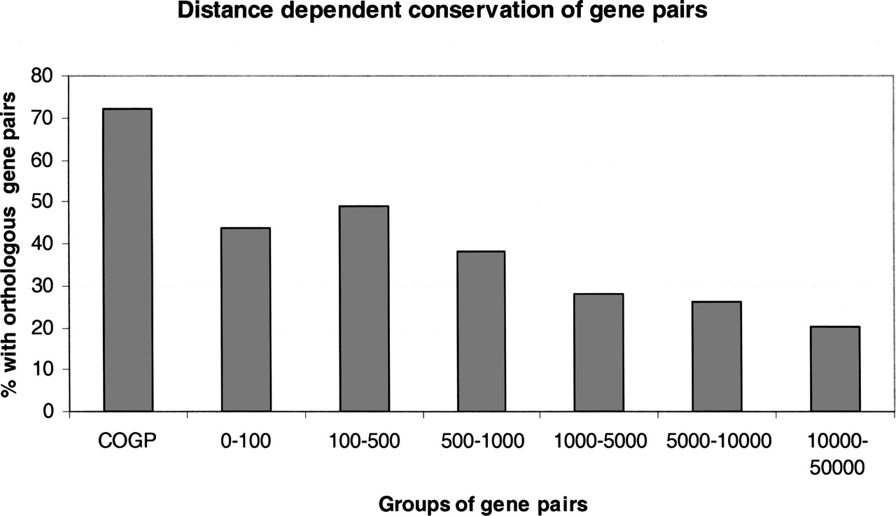 Distance dependent conservation of overlapping gene pairs. Each bar represents the percentage of gene pairs in C. elegans that have orthologous gene pairs in C. briggsae. (COGP) Convergent overlapping gene pairs; (0–100) adjacent gene pairs in which two genes within a pair are separated by 0–100 bp genomic sequences; similarly, (100–500), (500–1000), (1000–5000), adjacent gene pairs in which two genes within a pair are separated by 100–500, 500–1000, 1000–5000, 5000–10,000, and 10,000–50,000-bp genomic sequences, respectively.