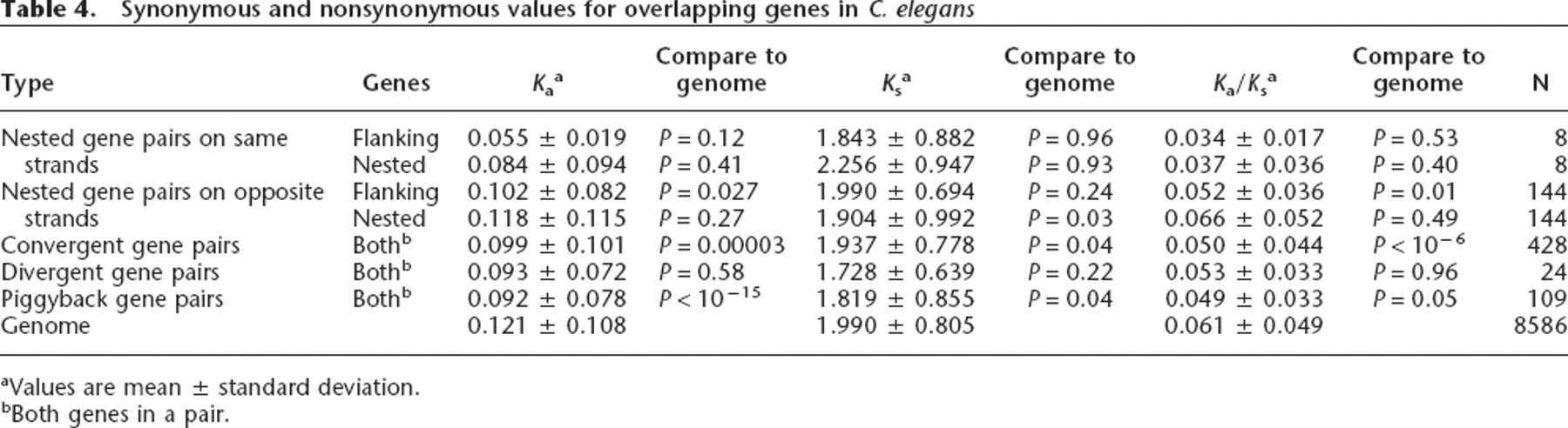 Synonymous and nonsynonymous values for overlapping genes in C. elegans
