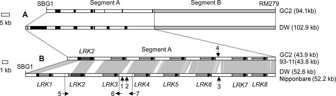Identification of the LRK gene cluster associated with the mapped QTL. (A) Schematic diagram of the sequence comparison in the QTL region flanked by the markers SBG1 and RM279 between Guichao2 (GC2) and Dongxiang wild rice (DW). Based on the extent of sequence divergence, the orthologous segment was divided into two sections. Segment B (represented by the lightly shaded rectangles) showed 99% sequence identity. The sequence of segment A exhibited extensive variation (represented by black bars or lines). (B) Sequence alignment of the LRK gene cluster in segment A between Guichao2 (or 93–11) and Dongxiang wild rice (or Nipponbare). Conserved sequences are connected by vertical areas. Horizontal arrows in shaded rectangles indicate polarity and position of LRK gene copies. Upward vertical arrows 1, 2, and 3 indicate position 337, 36, and 66-bp indels between Dongxiang wild rice and Nipponbare, respectively; downward vertical arrow 4 indicates the position of a 38-bp indel between Guichao2 and 93–11; horizontal arrows 5, 6, and 7 indicate polarity and the position of three gene fragments within the LRK cluster.