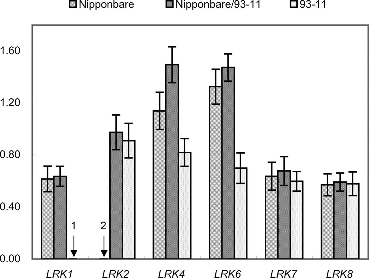 Allelic expression variation of LRK genes in Nipponbare, 93–11, and their hybrid cross Nipponbare/93–11. Rice seedlings at the three-leaf stage were processed for the measurement of the transcript level using RT-PCR. Expression levels of LRK genes were evaluated relative to that of actin1. Error bars, standard deviation (SD). Vertical arrow 1 indicates loss of LRK1 in 93–11, and vertical arrow 2 indicates that transcript was not detected in Nipponbare.