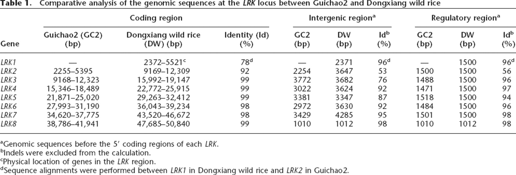 Comparative analysis of the genomic sequences at the LRK locus between Guichao2 and Dongxiang wild rice