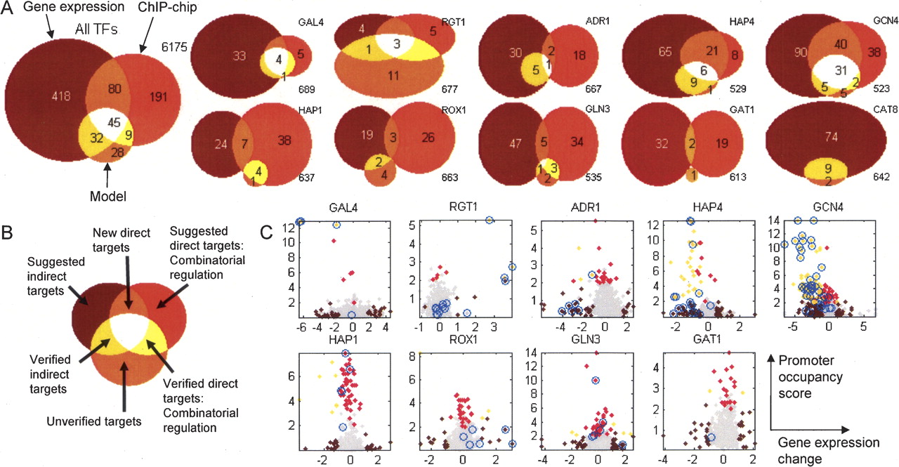 Comparison between expression changes in TF knockout and overexpression strains predicted by iMH805/775, in vivo observed expression changes, and promoter occupancy for the corresponding TFs derived from ChIP-chip and motif data. (A) Overlaps between the three data sets shown in the form of Venn diagrams. The numbers refer to the number of genes in each category out of the total of 750 metabolic genes. (B) Interpretation of each of the segments in the Venn diagrams shown in A. (C) Scatterplots of the gene expression changes in TF knockout/overexpression strains (log2 ratios between knockout strain and wild type) and the corresponding promoter occupancy scores derived from ChIP-chip data (−log10 of the P-value reported in Harbison et al. [2004). The genes that were predicted to change in expression by the iMH805/775 model are indicated by blue circles. Genes with significant gene expression change or promoter occupancy are colored using a color scheme similar to the one used in the Venn diagrams in A.