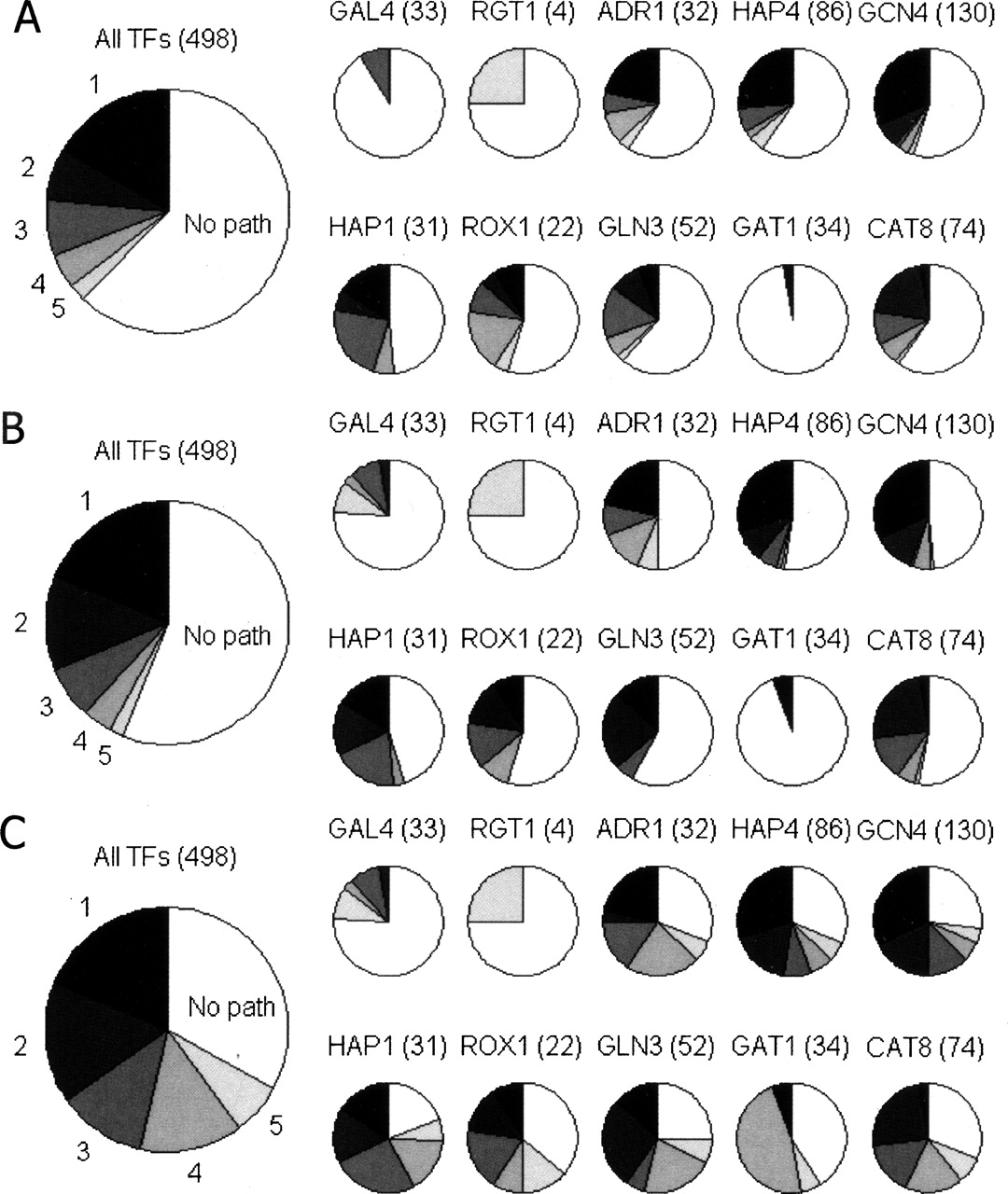Results for the three regulatory network expansion scenarios (A,B,C) using a combination of the iMH805/775 network and a provisional regulatory network derived from ChIP-chip and TF-binding motif data. Each pie chart indicates the fractions of potential target genes that can be reached from the TF through regulatory cascades containing one to five steps as well as the targets that cannot be reached in five or less steps from the TF. For each strain, the numbers of potential novel targets are indicated in parenthesis. (A) Expansion using ChIP-chip and motif data for the 55 TFs in iMH805/775 assuming that each TF can only act as a repressor or activator depending on its known type of activity. (B) Expansion using the same ChIP-chip and motif data, but allowing each TF to act either as repressor or activator. (C) Expansion using ChIP-chip and motif data for all 203 TFs studied in Harbison et al. (2004) allowing each TF to act either as repressor or activator.