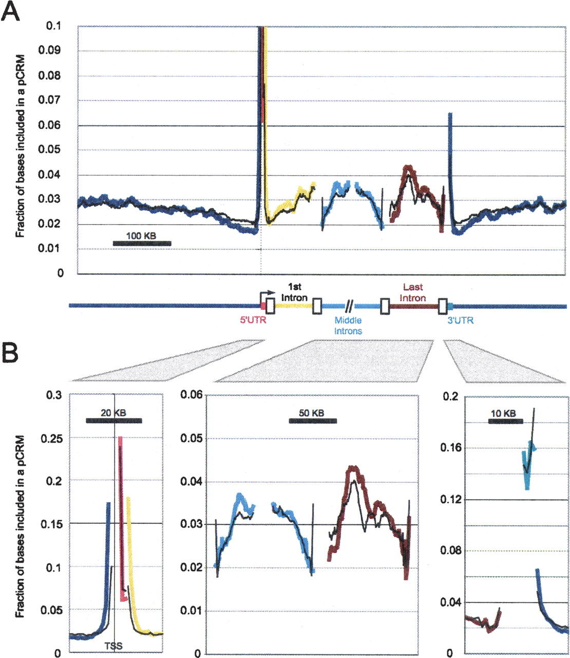 Distribution of pCRMs relative to specific regions of genes. The genome was divided into several types of noncoding regions: upstream of a gene (dark blue), 5′ UTR (pink), 1st intron (yellow), internal introns (light blue), last intron (brown), 3′ UTR (aqua), and downstream region (dark blue). (A) For each type of region, the fraction of bases included in a pCRM is graphed as a function of the distance to a reference point. For upstream regions, 5′ UTR, and first intron the reference point is the gene’s TSS. For middle introns the closest 5′ or 3′ intron boundary is used. For the last intron, the 3′ UTR and the region 3′ of the last exon, the 3′ end of the mRNA is used. Note that the 3′ UTR is off the scale in A. (B) Same as in A, but different scales are used for the x- and y-axes in order to better show the characteristics of all regions.