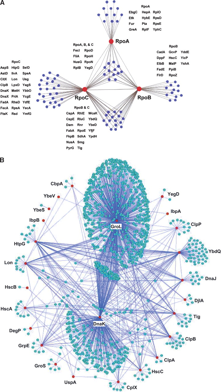 Subgraph of protein–protein interactions. (A) RNAP interacting protein network. Networks of proteins that interact directly (blue nodes) with each of the RNAP subunits, RpoA, RpoB, and RpoC (red nodes). (B) Molecular chaperone and their target network properties. Red nodes represent major chaperone proteins and blue nodes represent their targets. The largest cluster shows the GroL interaction network and the second largest one shows the network of DnaK.