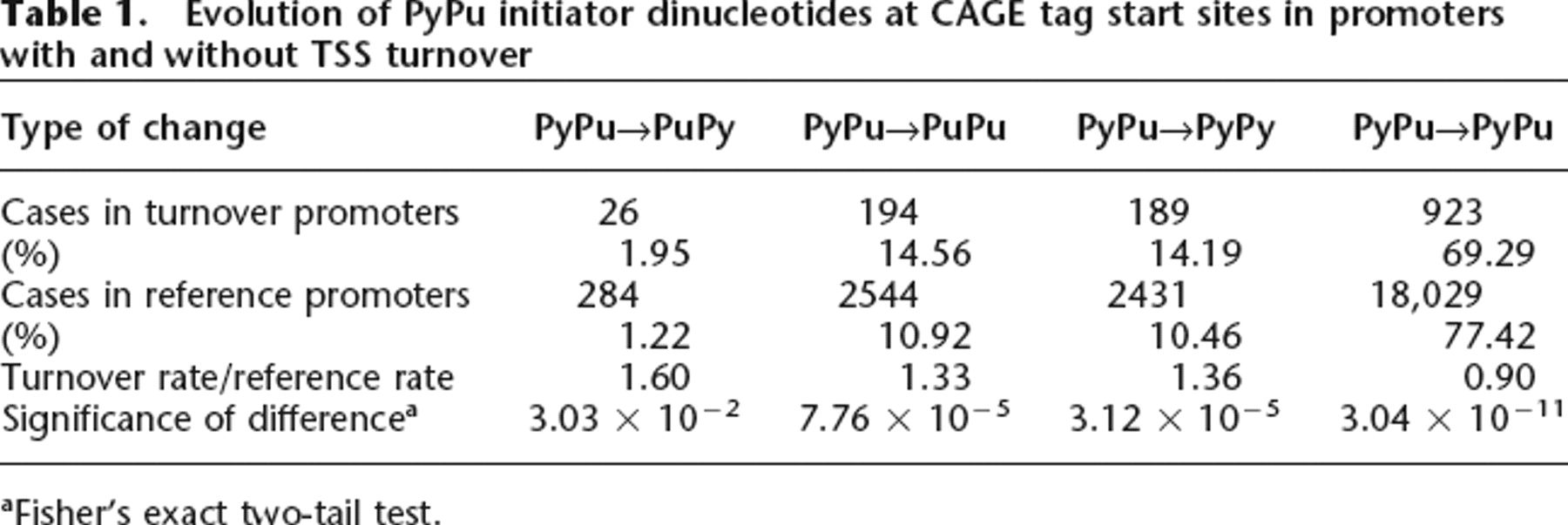 Evolution of PyPu initiator dinucleotides at CAGE tag start sites in promoters with and without TSS turnover